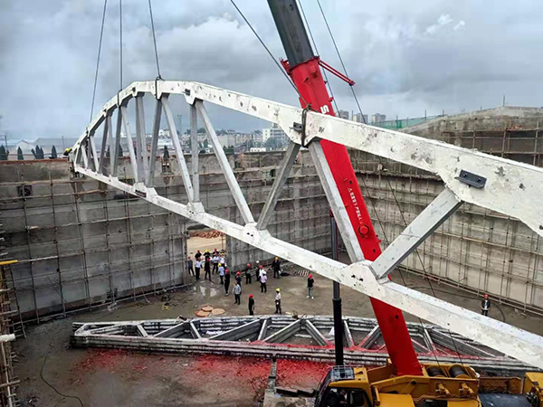 5#平房仓的仓顶由16榀预应力屋架梁和400块屋面板构成,每榀预应力屋架梁重14.24吨,长度达30米,平房仓的工作重点是预应力屋架梁的制作及吊装,工作难度大、技术含量高,项目部紧抓屋架梁预制这道关键工序,提前谋划,做好准备。